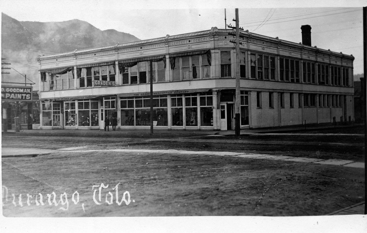 In February 1948, the  Graden Building suffered a catastrophic fire that began in the alleyway  separating the store and the warehouse behind. The structure was  destroyed. R. E. Sloan’s grandson Robert Ayres oversaw the construction  of a new building on the site at the northwest corner of 8th and Main to  be opened by the end of the year. Known as “The Nice Place to Shop,”  Graden’s outfitted generations of Durangoans before closing in 1986. The  building carried on, becoming one of the most desirable retail and  office locations in Durango.